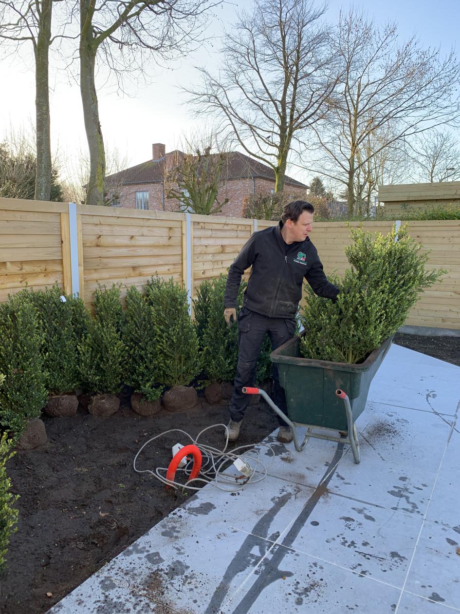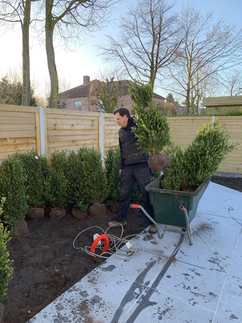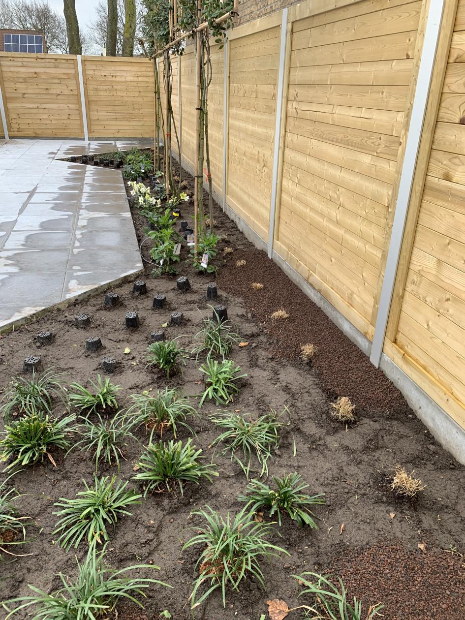 De leibomen achteraan zorgen voor extra privacy en een groen scherm ipv het zicht op de achterliggende woning.
