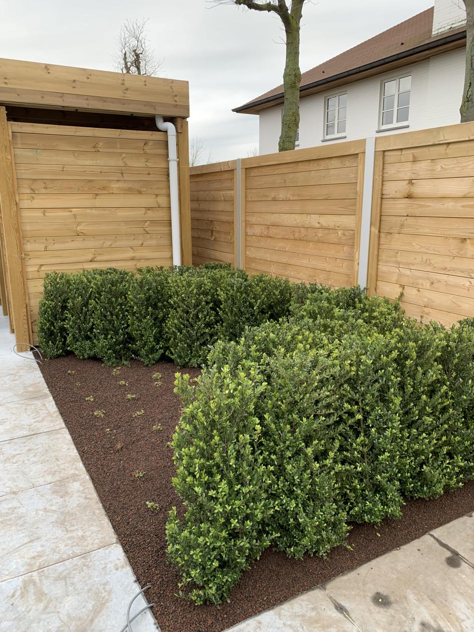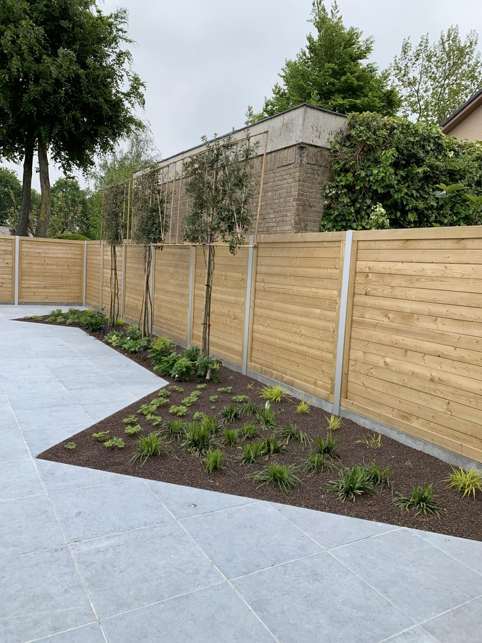 De groene hagen werden vervangen door een houten tuinomheining met aluminium palen.