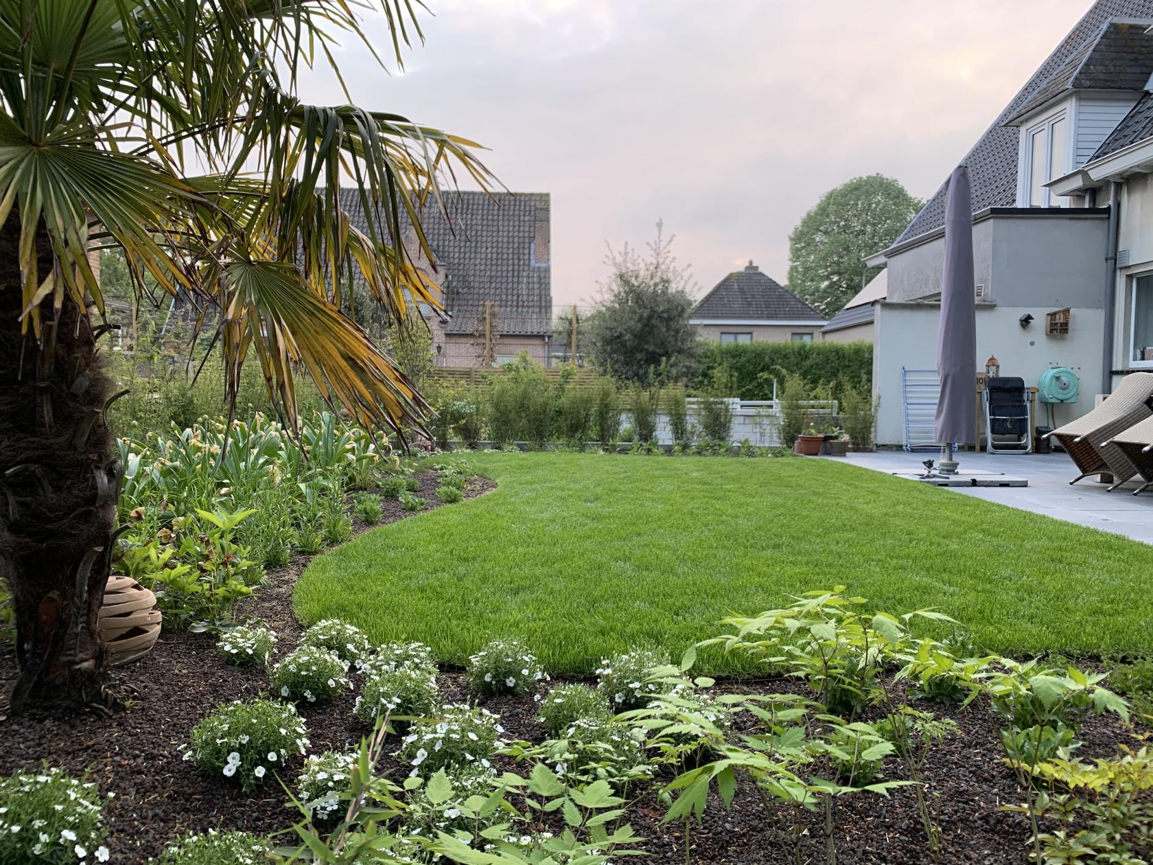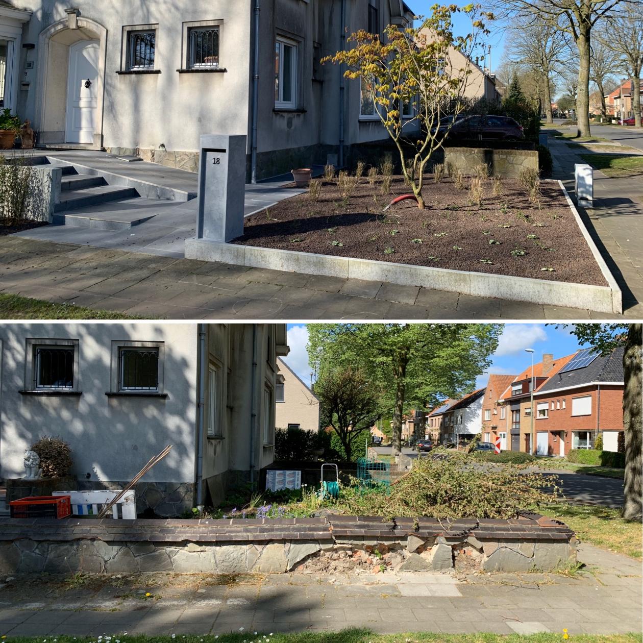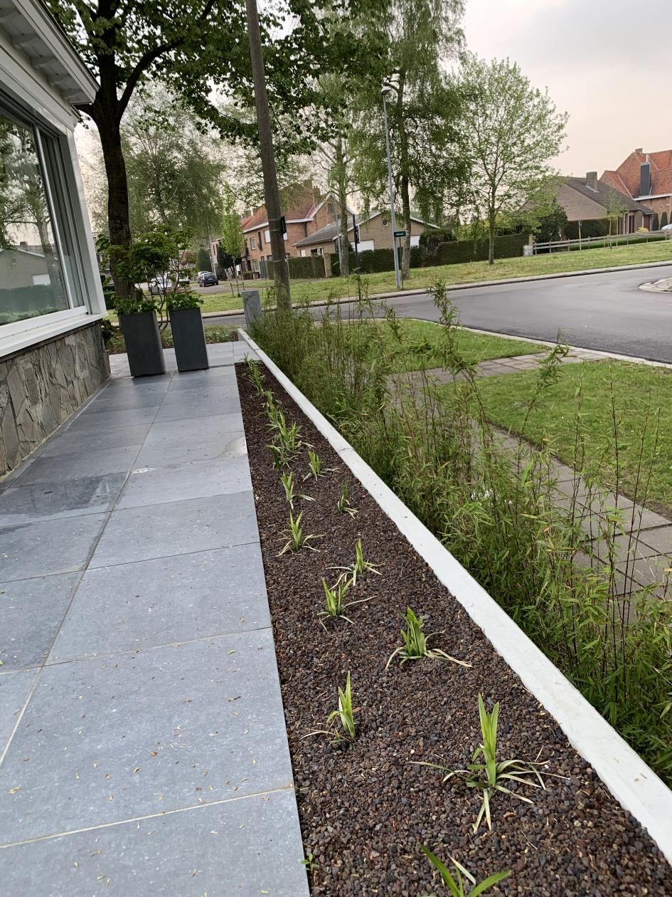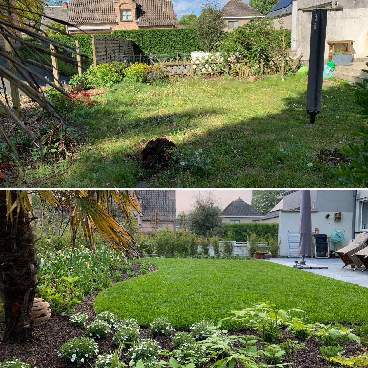 'Voor de volledige renovatie van onze tuin kozen wij voor tuinaanleg Bisschop. De renovatie omvatte: grondwerken zoals plaatsen van keerwanden, regenput, alle ondergrondse buizen vervangen, opvoeren met aarde. Daarnaast werd ook een ruim terras aangelegd, de volledige beplanting voorzien en graszoden. Wij kunnen eigenlijk vrij kort zijn over het team Bisschop. Het werkt als een perfect geoliede machine! Iedereen weet perfect wat hij moet doen, ze werken prachtig samen elk met zijn eigen specialiteit. Ook Dries staat steeds open voor ideeën of suggesties en helpt steeds zoeken naar oplossingen. Lindsay neemt dan weer het ontwerp en de voorbereidingen voor de aanleg van de planten voor haar rekening. Wat voor ons ook een groot pluspunt was is dat de offerte die gemaakt wordt tot op de cent klopt met de afrekening van de uitgevoerde werken. Ook planning en timing van de werken worden mooi nagekomen. Kortom: wij zijn zeer blij met onze keuze om met tuinen Bisschop gewerkt te hebben, we zouden het zo opnieuw overdoen. Echt een aanrader als je zoekt naar kwaliteit, mooie afwerking en goede prijs. Tuinen Bisschop is gewoon een topteam!
